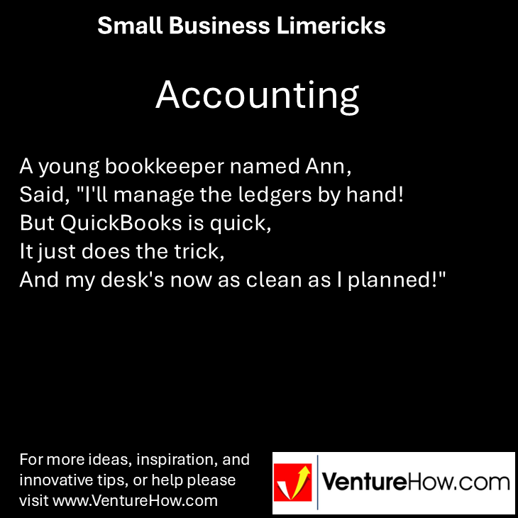 A young bookkeeper named Ann, Said, “I’ll manage the ledgers by hand! But QuickBooks is quick, It just does the trick, And my desk’s now as clean as I planned!”