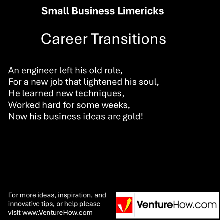 An engineer left his old role, For a new job that lightened his soul, He learned new techniques, Worked hard for some weeks, Now his business ideas are gold!