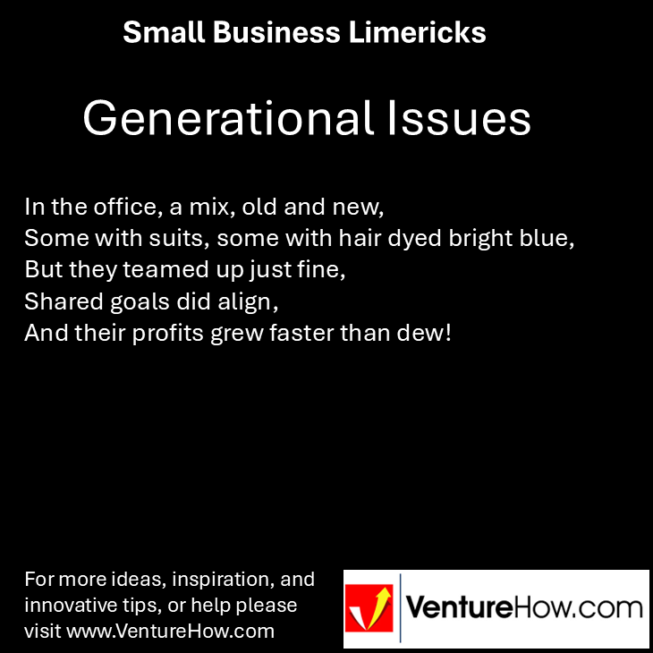 In the office, a mix, old and new, Some with suits, some with hair dyed bright blue, But they teamed up just fine, Shared goals did align, And their profits grew faster than dew!
